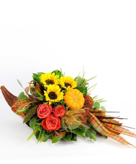 There's nothing more traditional and festive than a traditional cornucopia to celebrate Thanksgiving. This Cornucopia centerpiece comes designed with a modern twist with fall flowers in groupings such as Sunflowers, Roses, Disbuds, etc.