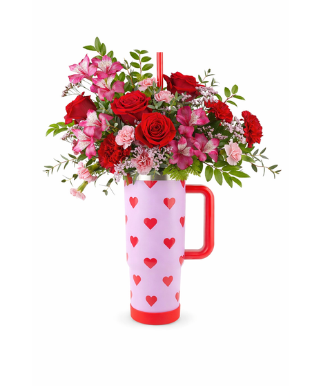 Featuring a romantic mix of lush red roses, soft pink alstroemeria, carnations, delicate accent florals, and fresh greenery, Cupid’s Cup is overflowing with love from every angle. The blooms are designed in a reusable, insulated tumbler adorned with playful red hearts — perfect for cozy drinks once the flowers have been enjoyed.