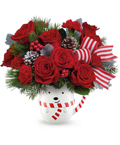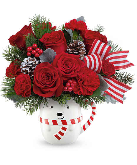 Bring a burst of holiday joy to any home with our Fairfield Frosty Bear Mug, the sweetest seasonal arrangement nestled inside an adorable keepsake bear mug. Designed with lush winter greens and festive red blooms, this charming piece delivers instant Christmas cheer.