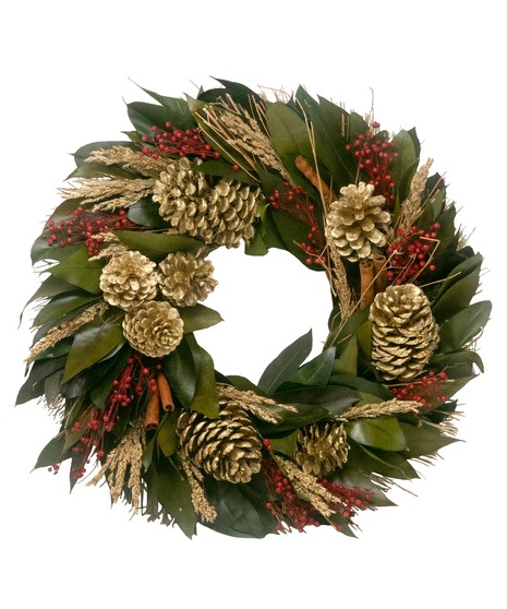 A festive wreath that is made on a twig base with gorgeous green leaves, red berry sprigs, grains, and accentuated with gold painted natural pinecones to fill the wreath out. - 18" diameter - Each wreath comes in a wooden crate - Made with natural dried materials
