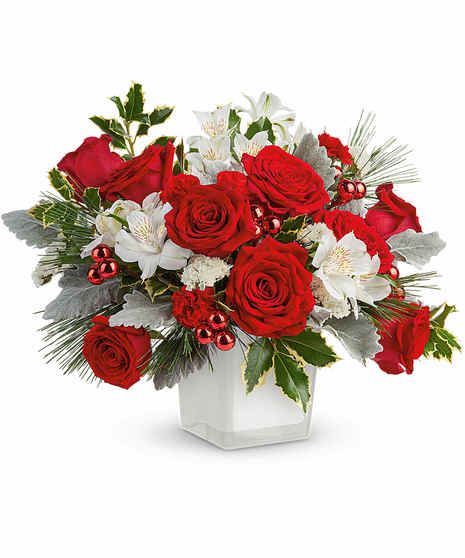 Bring the enchantment of the season home with Mistletoe Magic, a stunning holiday arrangement bursting with classic Christmas colors and festive cheer. Rich red roses and carnations pair beautifully with crisp white alstroemeria, snowy textured accents, and long winter greens. Shiny red holiday ornaments and variegated holly add the perfect pop of sparkle, creating a look that feels both elegant and joyfully traditional.