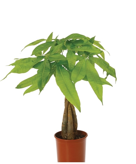 Aka: Malabar Chestnut & Pachira. Prefers indirect light and will tolerate low light. If the plant begins to yellow or wither, it needs more light. Likes humidity, so mist often