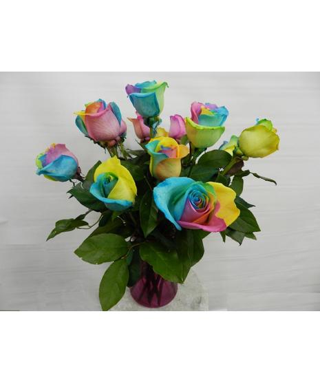 Rainbow pastel Tye Dyed roses arranged in a clear glass vase with greens. Available locally and very limited out of area. May have to be ordered in advance
