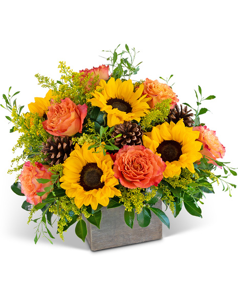 Capture the warmth of the season with our Rustic Pinewood Harvest arrangement a rich, textural design that blends the beauty of autumn blooms with natural woodland charm. Designed with golden hues, warm amber tones, and earthy greens, this piece features seasonal flowers such as Roses and Sunflowers accented by pinecones, fall foliage, and rustic textures that bring the spirit of the forest indoors.
