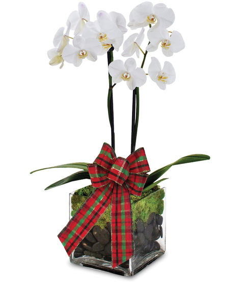 This beautiful White Phalaenopsis orchid plant arrives in a clear glass cube vase with river rock and moss with a finishing holiday bow!